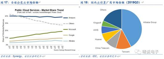 互联网云计算厂商是数据中心建设的主力军。根据我国2018年数据中心白皮书,2018年亚马逊和谷歌负责超过一半的新超大规模数据中心项目。数据中心占地面积最大亚马逊、微软、谷歌和IBM,每家公司都至少有55个数据中心。AWS云在全球运营55个可用区,每个可用区由一个或多个数据中心构成;IBM云数据中心遍布全球,数量达到60个。总体来看,全球市场份额位居前列的云计算厂商主要有亚马逊、微软、谷歌、阿里巴巴、IBM、Facebook等。国内方面,阿里以绝对优势领先,市占率持续达40%以上,往后依次递减为腾讯、中国电信、华为、亚马逊AWS、金山等,前六大厂商市占率之和超过70%。
