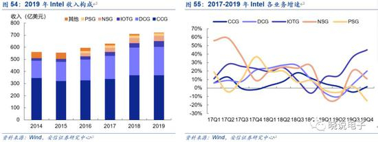 Intel的业务大致可以划分为客户计算CCG、数据中心DCG、物联网IOTG、非易失性存储器问题解决方案NSG、可编程系统PSG。Intel 2019年第四季度收入超出预期,其中DCG业务收入占比超过30%,2019年Q3开始扭转自2018年Q3以来持续下滑的态势,连续Q3和Q4两个季度增长,预示下游服务器需求企稳回升。