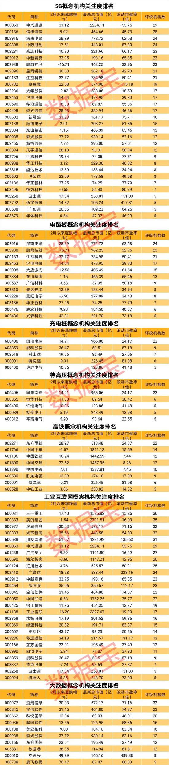 新基建有望成为贯穿全年的投资主题。对于本次会议提出要发力于科技端的基础设施建设,包括5G基建、特高压、城际高速铁路和城际轨道交通、充电桩、大数据中心、人工智能、工业互联网等七大“新基建”板块,证券时报·数据宝梳理出机构关注度较高的概念股龙头,以飨读者。