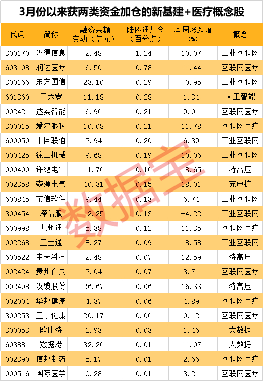 证券时报·数据宝统计显示,3月份以来新基建和互联网医疗板块中有23股获北上资金和港股资金同时加仓,其中互联网医疗板块有9股。