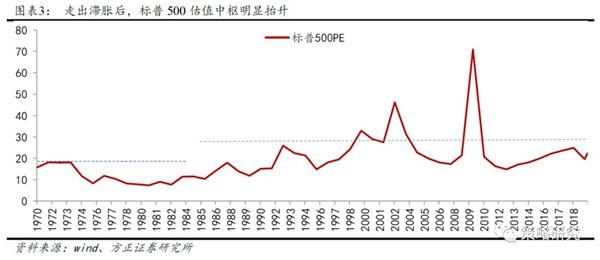 经济繁荣周期下,业绩回升,估值从修复走向泡沫。20世纪70年代至80年代初,两次石油危机引发的输入性通胀使美国深陷滞胀泥潭,美国经济也陷入二战以来的最严重衰退,持续高位的无风险利率对美股估值形成了强烈的压制。标普500指数PE从二战以后13.87倍的平均水平跌至1982年的7.73倍。前美联储主席沃尔克上台后,积极治理通胀,通过持续加息带领美国走出滞胀。随着高通胀得到治理,美国经济重回增长轨道并进入新一轮繁荣周期,美股近20年的超级大牛市也就此拉开序幕。1982年至2000年之间,标普500指数从113点涨至1510点,年复合增速15.7%,指数EPS从33美元涨至74美元,年复合增速4.6%,PE从8倍涨到29倍,年复合增速7.4%,前期受压制的估值中枢不仅在80年代得到了修复还在90年代后期逐渐泡沫化,最终互联网泡沫破裂,本轮超级牛市终结。