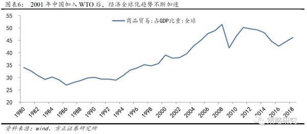 经济全球化加速以及居民部门加杠杆的推动。在应对互联网泡沫危机中,美国低利率环境形成,客观上推动了房地产行业的繁荣,对于经济复苏形成了强有力的支撑。同时,随着房价一路走高,居民部门开始撬动高杠杆进入房市并进一步形成财富效应。在这一时期,居民部门杠杆率由2002年的74.8%攀升至2007年的98.6%,上升幅度达23.7%,而同期政府部门杠杆率仅上升9.1%个百分点。另一方面,2001年中国加入WTO后,低价制成品使得全球贸易活跃度大幅提升,商品贸易占全球GDP的比重在这一时期快速提升,2008年达到51.44%的历史最高水平。美国作为全球最大的消费国在这一时期内充分受益,大量进口低价消费品使得通胀水平保持了了长期温和。中国的对外开放和经济高速发展又帮助美国企业获得了大量的市场份额以及利润,助力这一时期美股盈利水平的大幅提升。