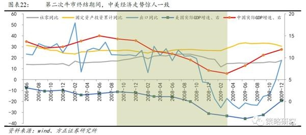 第二次牛市终结期间的中美经济周期惊人一致,同步持续下行未见背离,A股跟随同步下跌。尽管在第二次牛市终结、经济下行期间国内的固定资产投资维持在稳定的较高增速。且前期消费也有小幅度的增速提升,但这些有助于拉升经济增长的正面效应仍然不足以抵消出口恶化给经济下拉所造成的负面影响。因此综合来看,投资稳定和消费提升的正面效果无法抵消出口恶化的负面影响,因此本轮经济的方向始终被出口所主导,中美经济周期在整个美股牛市终结期间走向都十分一致,未有背离,这对A股如第一次牛市终结期间的逆势上涨缺乏核心支撑。