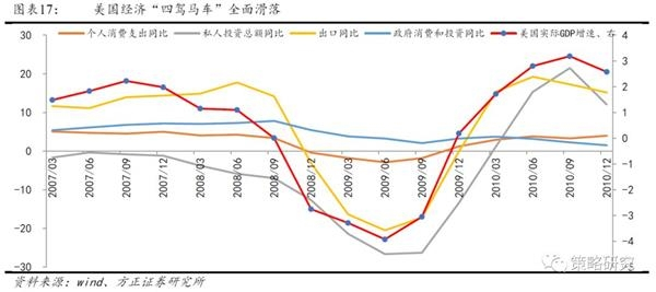 美国经济“四驾马车”全面恶化共同导致了此次经济危机。其中,个人消费支出同比增速从2007年9月份的4.51%,滑落到了2009年6月份的-2.91%;政府消费和投资支出同比增速从2007年9月份的6.78%,滑落到了2009年9月份的2.03%;私人投资支出同比增速从2007年9月份的-0.86%,大幅滑落至2009年6月份的-26.64%;出口同比增速从2007年9月份的13.93%,大幅滑落至2009年6月份的-20.5%。四驾马车的全面恶化共同助演了本次的经济危机,导致美国经济增速从2007年9月份的2.22%,大幅失速下行至2009年6月份的-3.92%。