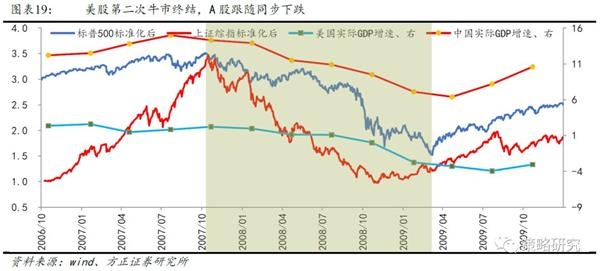在上述两个核心问题的大概率假设条件下,如果美股牛市终结,美股经济衰退,中国很难再现第一次牛市终结期间的经济走势短暂背离,更大的概率将是经济周期走向趋同,因此A股大概率仍会同步追随下跌。