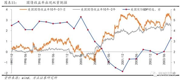 领先指标在经济出现崩溃态势之前已开始大幅滑落。①制造业PMI。1999年11月美国制造业PMI指数57就见顶,出现了拐点,随后开始转而滑落,到2000年Q3季度经济大幅跌落时就已经持续了近10个月的下滑,至49.7,落入收缩区间下运行;② 美国ECRI领先指标。2000年1月中旬,美国ECRI领先指标见顶,随后也开启了长期的滑落,几乎领先经济拐点一个季度,领先经济确认下行两个季度;③ 国债收益率双重倒挂。其一,10年期和2年期国债收益率倒挂从2000年2月初开始,一直持续到2000年12月底结束,倒挂时间持续了近10个月,倒挂时间领先经济确认下行时间8个月。其二,10年期和3个月国债收益率倒挂从2000年7月初开始,到2001年1月中旬结束,持续了6个多月,倒挂时间基本领先了经济确认下行3个月。