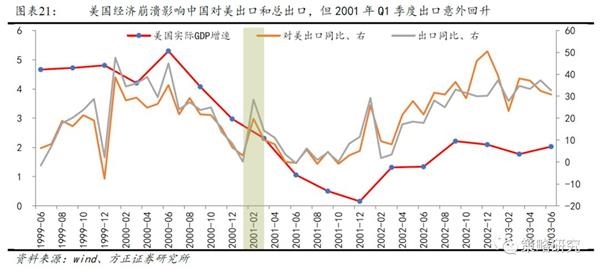 第一次美股牛市终结前期,A股演绎遵循了路径①,在2001年Q1季度的时候,对美出口和对外出口同时大幅回升,并且加之投资上行的拉动,这导致了Q1季度中国经济增速出现了大幅回升,有力支撑了中国当季度经济走势与美国经济走势的背离,彼时市场对经济的前景并不悲观。