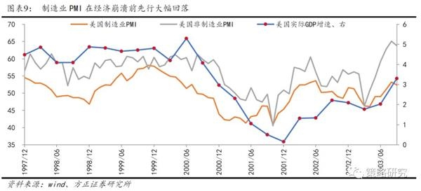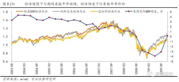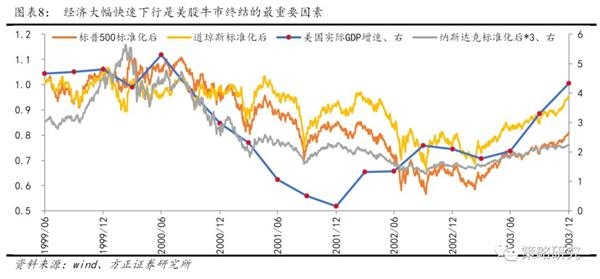 2、中美经济周期是否同步决定了A股对美股牛市终结的反应,若中美经济走势短暂背离,A股有可能逆势上涨,如2000年;若中美经济周期同步,A股大概率同步跟跌,如2007年。