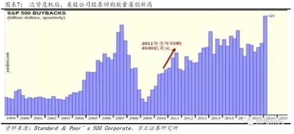 2009年至2019年的十年间,美国GDP年均增长率仅为1.85%,而标普500EPS的年均增长率却高达29.7%。除美股公司本身经营能力的提升外,股票回购功不可没,2009年一季度到2018年一季度,标普500指数成份上市公司回购总金额达4.23万亿美元,2018年公布的股票回购总额达到了创纪录的1万亿美元,对企业盈利增厚贡献近半数。美联储数据显示,截至2017年末,美国非金融企业累计购买3.37万亿美元股票,大幅超过ETF和共同基金累计购买的1.64万亿美元。与之相伴随的是,2008年后居民杠杆率的下降,2012年后政府杠杆率的持平,以及企业杠杆率的对应走高,2012年以来,美国非金融部门杠杆率上升7.8%,居民部门杠杆率下降8%,政府部门杠杆率上升3.3%。