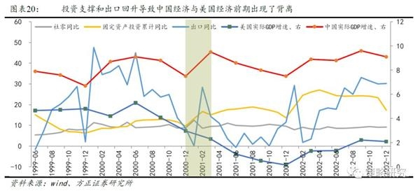 2001年Q1季度,中美经济背离的原因在于出口意外回升以及固定资产投资拉动经济。2001年Q1季度,出口增速出现了意外性回升(对美和非美出口皆回升),从1月份的0.1%增速,快速提升至了2月份的28.4%,三月份继续维持着14.3%的增长,整个一季度的出口状况明显得到了边际改善;此外,固定资产投资也为一季度经济的短暂上行提供了助力,固定资产投资累计增速从2000年的8.5%,在2001年Q1季度大幅改善,累计增速提升至15.1%。正是在出口意外性回升和固定资产投资增速大幅改善的支撑下,2001年Q1季度的经济增速从上个季度的7.5%提升至9.5%,上行了2个百分点,而同期美国经济增速却下滑了0.66个百分点,中美经济走势间出现了短暂但明显的背离。