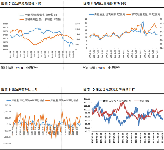 从供给端来看,2018 年三季度以来, OPEC 产油量持续下降,全球区域合计油井新钻数持续下降;2019 年 11 月以来现货租船和航运中的油轮运量均显现回落,原油产能和供给能力呈现下降。因此综合供需两方面来看,前述的净需求指标从 2019 年以来保持显著上行趋势, 应该说原油价格上行的供需基础是存在的。