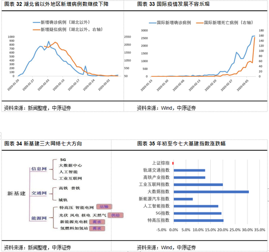 第四,国内外疫情发展形势的反差以及国内提出新基建规划,均有利于 A 股长线表现。目前国内疫情控制形势越来越明朗,新增病例数急剧下降,而海外处于疫情发展初期阶段,海外市场风险明显高于国内,因此A 股具备率先从低迷情绪中走出来的基础。