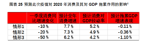 因此此次疫情将主要通过消费对经济产生冲击。而按季度计,消费增速对滞后一期、二期、 三期的边际影响分别为 0.69、0.12 和 0.02(以含三期滞后项的 OLS 回归系数计)。我们将疫情对消费产生的影响分为三种不同程度的情形,分别将使得一季度消费同比增速下降 10%、20% 和 50%,分别对应一季度社会消费总额少增 782 亿元、1558 亿元和 4058 亿元(市场预测春节期间消费市场损失在万亿元水平)。在这三种情形下,全年消费同比增速或分别为 7.7%、7.3% 和 6.2%。按照当前消费对 GDP 拉动率计算,在中性情形下,我们认为此次疫情仅通过消费将累计拖累全年 GDP 增速或达到 0.4 个百分点。