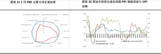 从当前经济表现来看,由于冠状病毒疫情的影响,我国 2 月份经济表现暗淡。数据显示, 我国 2 月PMI 直接下降至 35.7%,前值为 50.0%,降幅基本在市场预期之内。从分项来看,除产成品库存、主要原材料购进价格和出厂价格 PMI 环比变化不大,企业生产单位利润收缩较小, 但其余生产和订单方面PMI 均大幅下降,显示出 2 月份总需求全面收缩,企业经营压力仍然较大。而此次原油价格下跌,更是直接推动 2 月 PPI 增速再度回落,CPI 增速维持在高位,PPI 和 CPI 背离加深,我国经济由于需求收缩正面临结构性通缩的风险。这与原油价格变化也是密不可分的。
