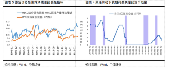 首先,供需失衡造成的净需求波动是原油价格下跌的根本原因,或由于全球经济增速下降, 或由于 OPEC 增产。如 1997 年、2001 年和 2008 年是典型的由于金融危机造成全球经济表现失速从而推动原油价格下跌;而2001 年的下跌也含有OPEC 增产原因,2014 年则是由于OPEC或为了抵抗页岩油而拒绝减产造成的下跌。如果我们以 OECD 领先指标为需求指标,OPEC 产量月度环比变化为供给指标,二者之差即代表全球月度原油净需求的变化,可以看出,原油价格波动领先或同步反映了全球净需求的波动,二者走势总体较为一致,每当原油净需求出现快速上升,都会伴随原油价格提前或同步攀升;而原油净需求回落,又会推动原油价格下跌。这应该是原油价格变化的根本原因。