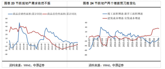 地产开工和销售是经济风向标。从地产表现来看,一般地,地产景气度会沿着“新开工- 施工-竣工”链条传导,因此如果新开工面积持续高于竣工面积增速,则表明地产处于上行阶段, 投资不断增加,供应不断满足新增需求;同时施工就意味着建筑成本上升,在新开工增速超过竣工增速情况下,应该表现为建筑成本增速超过安装成本增速,因此竣工增速/新开工增速与建筑成本增速/安装成本增速两个剪刀差应当一下一上,表明地产景气度不断改善。
