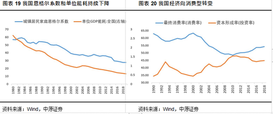 由于经济转型,过去 40 年,我国居民恩格尔系数和单位 GDP 能耗持续下降,我国产能的结构正在有效转型,因此我国经济边际上对能源的需求也正在下降。
