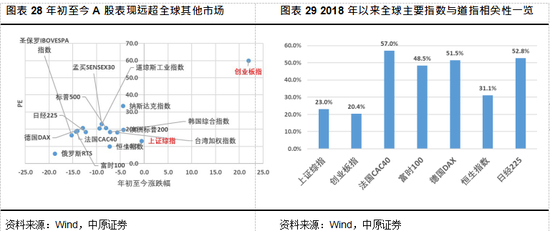 首先,目前在全球重要市场中,A 股仍是与美股相关性相对较低的市场。2018 年至金沪指和创业板指与道指的相关性分别为 23%和 20%,远低于法国 CAC40、富时 100、德国DAX和日经指数与道指的相关性,因此A 股在全球资产配置中具有明显的风险分散功能;其次,2018 年以来 A 股国际化进程明显加快,A 股迎来一个投资便利性不断提升的阶段。