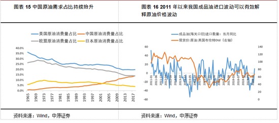 据统计,截止 2018 年我国原油需求占比已经达到 13.9%,已经与欧盟持平,与美国之间的落差缩小至历史最低水平;2019 年中国能源需求甚至占据了 2019 年世界原油需求增长的80%,已经成为能源需求最大的来源;从历史表现来看,2015 年以来,我国成品油进口数量的增速与原油价格波动比较契合,而此前二者相关性并不明显,这也反映了我国能源需求变化对于世界能源市场的重要影响。