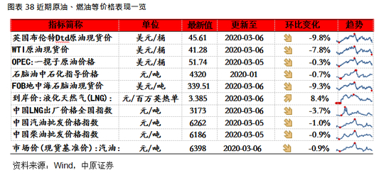 细分行业方面。首先,原油价格下跌带动 LNG 价格走低,并叠加 LNG 加气站的进一步增加,加气便利性与储运成本摊 薄可以带动天然气重卡进一步加速渗透,提升相关汽车子板块的需求预期;其次,原油价格下跌造成储油被动增长,前述航运中的海上浮仓量有望上升,燃油成本下降,对原油航运构成利好。但整个航运板块来看,受制于疫情影响,市场需求