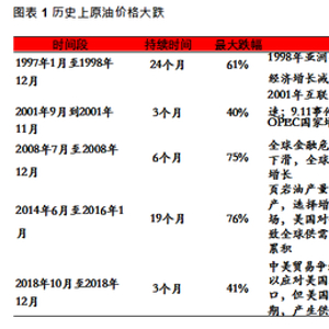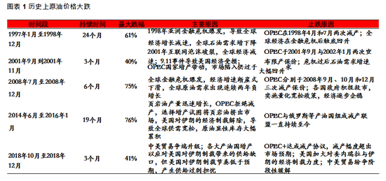 首先,我们以史为鉴,从历史中寻找原油出现大幅下跌的一般规律。近 30 年来,原油价格出现过五次显著下跌,我们将五次下跌历史整理如下: