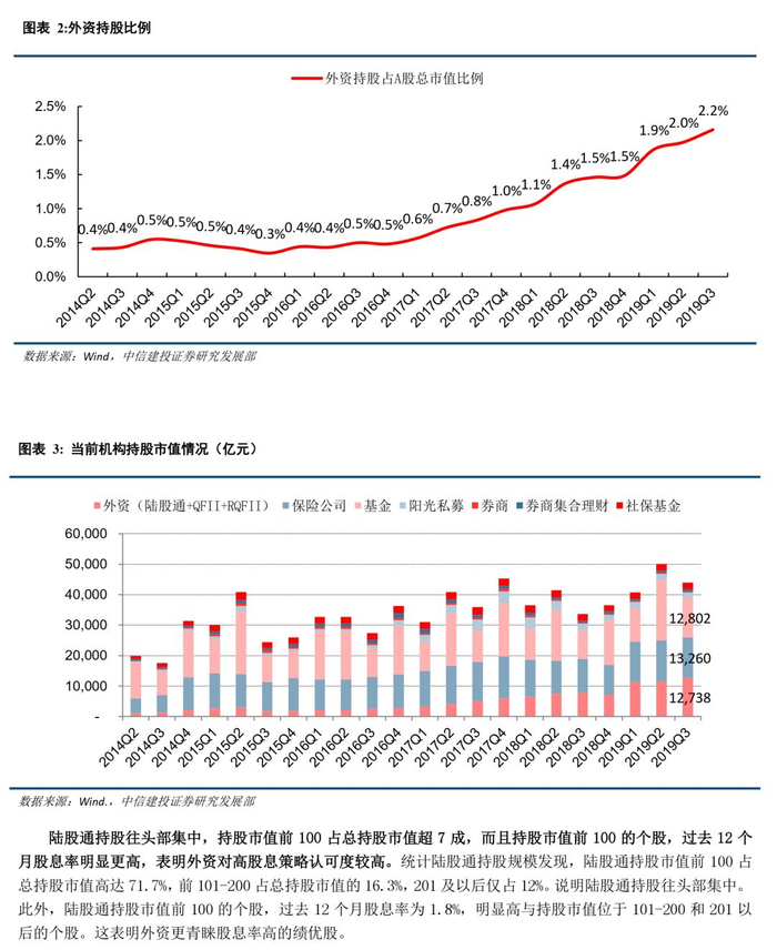 外资持股市值达1.27万亿,当前已成A股最为重要的机构投资者之一,随着A股市场国际化程度不断加深,外资持续增配A股的趋势较为确定。我们从wind导出按机构汇总的机构持仓数据,截至2019年三季度,外资、保险和公募基金持股市值分别为12,738亿元、13,260亿元和12,802亿元。短短6年时间,外资持有A股的市值增加了11,784亿元,外资持股占A股总市值比例由0.4%上升至2.2%,外资、保险与基金三大机构投资者现已呈三足鼎立态势。此外A股市场国际化程度不断加深,从2019年年底到2020年一季度,MSCI收集市场反馈并择时对是否进一步扩大纳入进行全面咨询。根据此前MSCI咨询征求意见的结果,A股对冲工具不足、股票资金结算周期短、互联互通的假期风险、逐渐向综合交易账户过渡等四方面的问题,是继续扩大纳入的阻碍,且短时间内解决较为困难。A股、港股和中概股在MSCI新兴市场指数总权重已占三成,而在MSCI全球指数总权重中仅为4.5%。随着MSCI逐步扩大纳入,中国相关权益占比会逐步增加。因此预计外资持股市值后续仍有进一步上升空间。纵观全球市场,A股相对其他市场的吸引力将更加明显,外资持续增配A股的趋势较为确定。