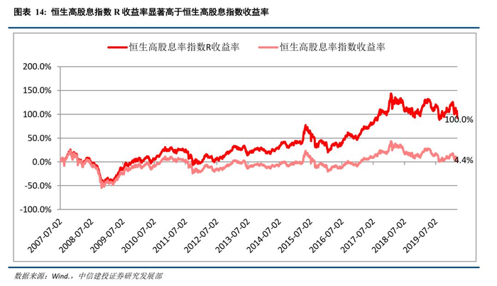 恒生高股息率指数R是恒生指数公司于2012年12月推出,这项指数包括了最高净股息率的50只于香港交易所上市的股票及/或房地产投资信托基金,基期是2007年6月29日。恒生高股息率指数的股息要求是“最少连续三年的现金股息派发记录”。恒生高股息率指数属于恒生股息累计指数系列,股息累计指数于每个交易日收市后编算及发布,该指数考虑到了投资者从持有的股票可获得的两类回报,即资本利得和股息收益。恒生高股息率指数R的选股范畴包括所有以香港交易所作第一上市的股份及房地产投资信托基金,但并不包括第二上市的股份、外国公司、优先股、债务证券、互惠基金及其他衍生产品。恒生高股息率指数R的波幅准则为不包括过往一年的历史波幅最高的25%股份/房地产投资信托基金。指数以2007年6月29日为基准日,以1000为基值。成份股于指数中的比重是根据净股息率分配,从而提升指数的回报率。此外为免指数偏重个别股份,设有百分之十的股份比重上限。相比于恒生高股息率指数R,恒生高股息率指数未考虑红利再投资,所以可以看到随着时间的推移两者收益率的差距更加明显。