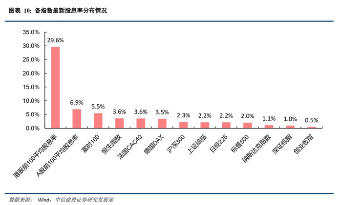在总体股息率方面,港股股息率在全球领先,同时显著高于A股股息率。统计过去12个月股息率情况,港股前100平均股息率高达29.6%,远远领先第二名和第三名的A股前100(6.9%)与富时100的(5.5%)。与此同时,恒生指数平均股息率在全球市场名列前茅,远高于上证综指、深证综指和创业板指。