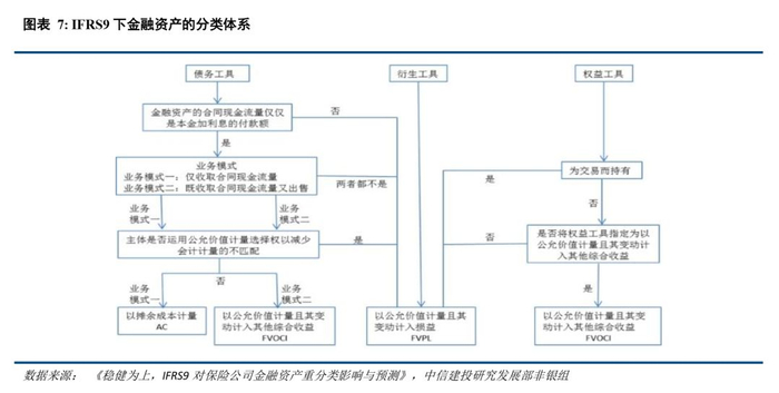 参考中信建投非银组在《稳健为上,IFRS9对保险公司金融资产重分类影响与预测》报告中的观点,在金融资产分类上,IAS39的分类是规则导向的,金融资产可分为交易性金融资产、可供出售金融资产、持有至到期投资、贷款及应收款。这种分类方式缺乏清晰的逻辑依据同时也过于复杂。而IFRS9分为以公允价值计量且其变动计入当期损益的金融资产、以公允价值计量且其变动计入其他综合收益的金融资产和以摊余成本计量的金融资产,即金融工具类型将由四分类变为三分类。