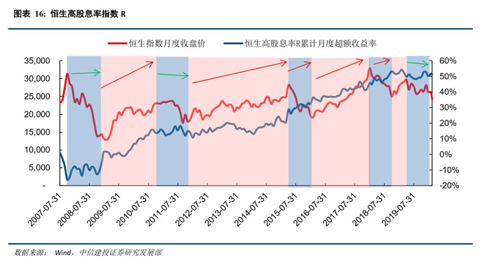 2007年以来港股共经历了四轮牛熊,高股息策略在港股市场牛市不弱,熊市抗跌。(1)2007年10月到2008年10月:香港市场受次贷危机爆发影响,出现大幅调整,恒生指数跌幅高达67%,高股息策略防御属性凸显。(2)2008年10月到2010年11月:在国内“四万亿”政策刺激下,中国经济走出泥淖,与此同时货币政策宽松,恒生指数期间涨幅高达134%,而高股息策略在此期间也表现突出。(3)2010年11月到2011年10月:欧债危机爆发,港股再次下挫,恒生指数下跌35%,高股息策略在此期间收益保持平稳,能有效保本。(4)2011年10月到2015年4月:恒生指数温和上涨77%,高股息策略与其走势一致;(5)2015年4月到2016年2月:受A股股灾影响,港股同样深度调整;(6)2016年2月到2018年1月:恒生指数在两年间反弹83%,高股息策略同步上涨;(7)2018年2月到2018年10月:国内去杠杆,经济增速下滑,上市公司业绩滑坡。加上美联储加息流动性紧缩,恒生指数下跌27%,高股息策略防御属性突出;(8)2018年11月至今:在内部社会动荡,海外风险高企的冲击下,恒生指数震荡调整,高股息策略保本属性突出。港股高股息策略在熊市通过股利再投资缓和下跌损失,在熊市中防御属性突出。而在牛市中,由于可以通过再投资的方式增加手中筹码,其组合收益率也更强,总体呈现“牛市不弱,熊市抗跌”的特性。