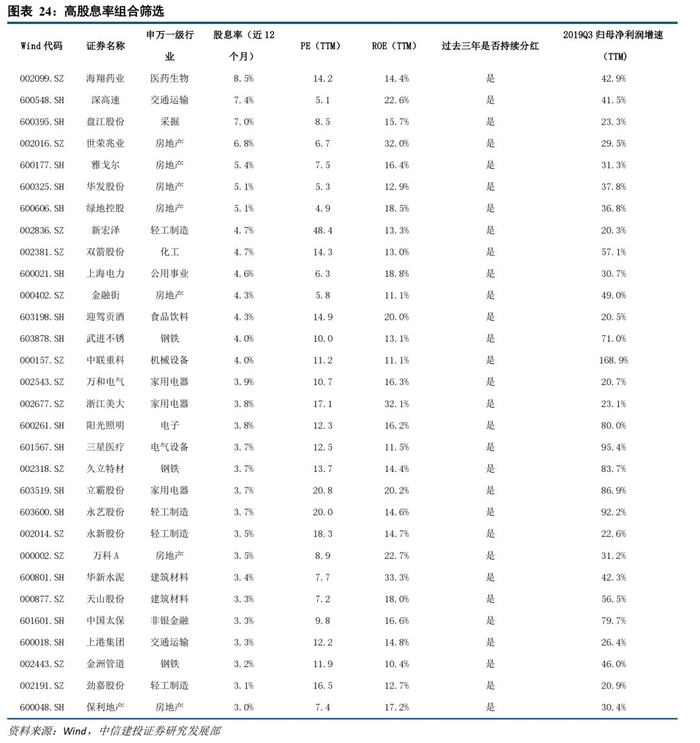 为成功挑选盈利能力和现金流均良好高股息公司,我们综合考虑企业最近12个月股息率、净资产收益率、经营性现金流等情况,设置的筛选条件为:(1)股息率大于等于3%;(2)ROE(TTM)大于等于10%;(3)2019Q3归母净利润增速(TTM) 大于等于20%;(4)并且过去三年需要持续分红;(5)最近一期经营性现金流入净额为正。我们筛选出以下30个标的,作为