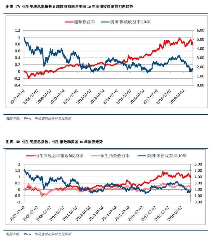 港股市场中高股息策略在低利率时期优势较大。因为高股息率股票具有“类固定收益资产”的特点,所以在大多情况下,影响投资者是否购买高股息股票的一个重要因素是股息率相对债券收益率的吸引力,当股息率相对债券类产品收益率有优势时,买入高股息股票,反之当股息率相对其他债券品种无优势时则卖出高股息股票而买入高收益债券获取超额收益。换言之高股息股票指数与国债有较为明显的替代效应,这一效应在港股市场有较为明显的体现。可以看到恒生高股息率指数R超额收益率与美国10年国债收益率呈“剪刀差”走势,国债收益率在走低的同时恒生高股息指数R在逐渐走高。