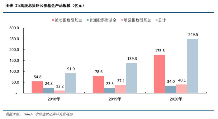 过去三年高股息策略公募基金产品总规模大幅度上升,被动指数型基金占比最大。对过去三年高股息策略公募基金产品规模进行统计,可以发现基金产品总规模在大幅度上升,三年间总规模上升了2.7倍。其中,被动指数型基金占比最大且增长幅度较大,截至今年规模已达175.3亿元,普通股票型基金三年增长幅度相对较小,在19年规模略有下降但2020年至今规模又增加至34亿元。而增强指数型基金虽然规模占比在2018年最小仅为13.3%,但三年间增长速度最快,到2020年已达到40.1亿元的规模,占比16%。