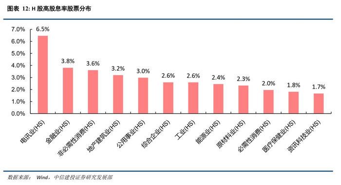 在H股市场,高股息率股票也更多是在金融地产和公用事业等板块,电讯业名列前茅主要原因是和记电讯。目前排名前五的行业分别为电讯业(6.5%)、金融业(3.8%)、非必须消费(3.6%)、建筑地产(3.2%)和公用事业(3.0%)。和记电讯香港股息率高达61.5%,是电讯业平均股息率排名靠前的主要原因,剔除后平均股息率仅为3.0%。排名后五的行业则主要是资讯科技业(1.7%)、医疗保健业(1.8%)、必需性消费(2.0%)、原材料业(2.3%)和能源业(2.4%)。
