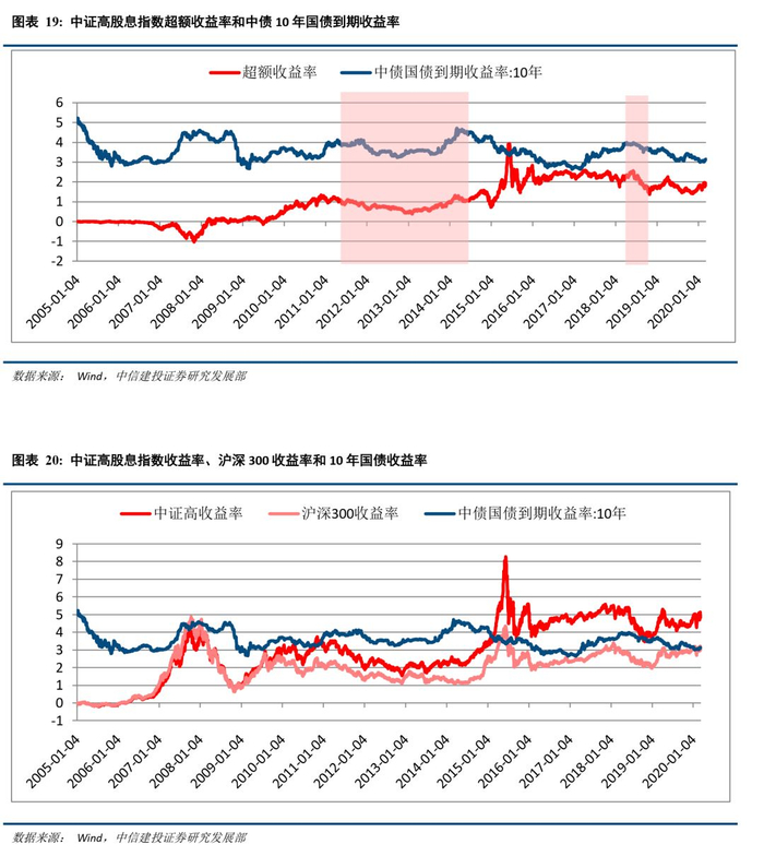 从实践看,高股息策略在长期有效主要有三个原因:(1)高股息股票通常带来高额的再投资收益。高股息股票组合与低股息股票组合在相同的市场中股价收益率差异细微,但是高股息股票会拥有更高的股利再投资收益。投资者在收到股利分红后会将其再度投入到股市以增加其持股的数量,这会带来股价上涨和持续分红两方面互相促进的收益。以沪深300全收益指数为例,沪深300指数只代表“盈利再投入”后的业绩增长;而全收益指数则代表了“盈利再投入”与“分红”所共同带来的业绩增长。自2008年年末至2019年末,沪深300指数与中证红利指数分别上涨 148%、178%,而包含了再投入的沪深300全收益和、中证全收益指数涨幅分别到达了205%、289%,且两者之差逐年扩大的态势。在海外投资市场,高股息策略已经广泛被市场所接受,作为股票投资者获取收益的重要形式之一,现金股利分红是最为稳定和可靠的收益。以约翰.涅夫(John Nev)管理的温莎基金(Windsor Fund)为例,作为基金经理其一直坚持“收益有保障”的理念来进行股票投资,在其运作温莎基金的30年间,其平均涨幅每年都超过标普500指数3.15%,股利回报率达到2%。;(2)高股息股票分红后常吸引更多资金涌入,进而出现“填权行情”。能够拥有持续稳定的营业现金流并支付高额分红的公司绝大多数已经处于成熟期,在长期的经营过程中建立了可持续的竞争优势。“填权行情”反映出这些高股息公司有着较强高的成长前景,进而推动着更多的资金涌入填权股行情,进一步推动股价上涨。(3)高股息策略可以规避股价下行风险。Gombola和Liu(1993)的研究能够得到高股息策略的另一个作用,通过高股息率股票稳定、确定的分红收益来缓和熊市期间股价下行趋势所带来的投资损失。通过统计研究期间以及三个不重叠的五年子区间内股票收益率和牛熊市的关系,可以发现,股票收益率与熊市期间的股息率呈正相关,而与牛市呈负相关,给投资带来更为安全的边际。