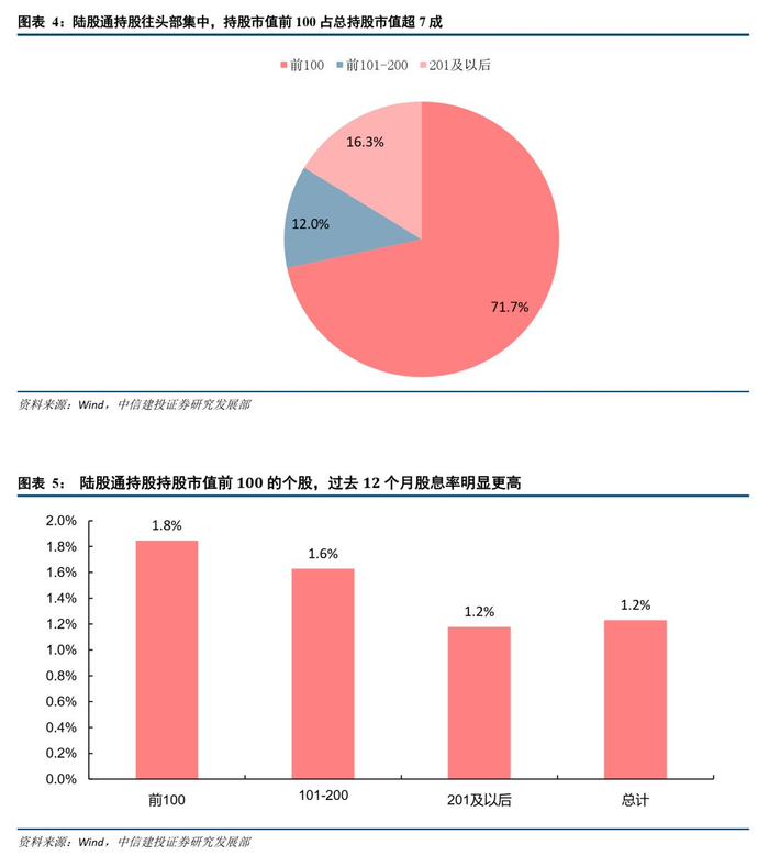 陆股通持股往头部集中,持股市值前100占总持股市值超7成,而且持股市值前100的个股,过去12个月股息率明显更高,表明外资对高股息策略认可度较高。统计陆股通持股规模发现,陆股通持股市值前100占总持股市值高达71.7%,前101-200占总持股市值的16.3%,201及以后仅占12%。说明陆股通持股往头部集中。此外,陆股通持股市值前100的个股,过去12个月股息率为1.8%,明显高与持股市值位于101-200和201以后的个股。这表明外资更青睐股息率高的绩优股。
