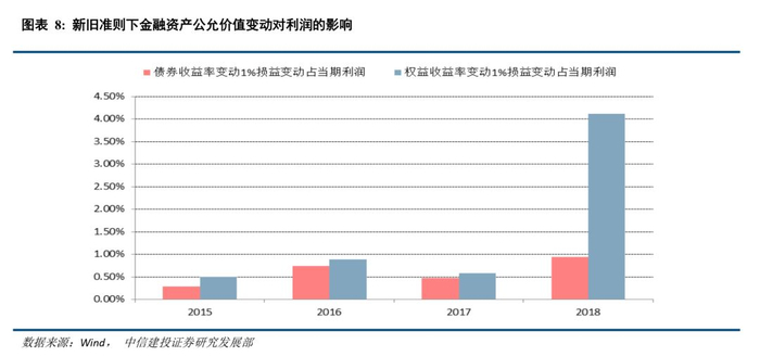 在旧准则下,变动计入当期损益占金融资产比例较少,其公允价值变化对利润的影响也较少,且企业能通过可供出售金融资产的处置损益来调节利润,使利润平滑;而在新准则下,FVTPL(变动计入当期损益)大大增加且主要以波动更大的权益类投资组成,经测算,1%的权益类投资收益率变化能导致4.12%的当期利润变化,而旧准则下2017年数据,利润变化敏感度仅为0.57%。在新准则下,上市险企的利润波动或被加大。