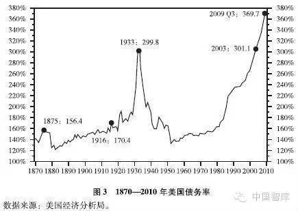 4.在公共政策空间被挤压得很小的情况下,发达国家政府所采取的民粹主义政策通常是危机的推手。技术变革和分配差距扩大造成的心理压力,往往会引起社会公众的不满,在执政期内无力改变现状和选票政治的推动下,政府倾向于更多地采取民粹主义政策宣示,安抚民心。上次危机美国总统作出“每家的后院有两辆汽车、每家的锅里炖着一只鸡”的承诺;而这次危机发生前,两任总统都承诺提高住房自有率①。欧盟国家从20世纪90年代末以来,税收占GDP的比重持续下降,但社会福利支出占GDP的比重持续上升,社会福利安排出现过度化倾向,但绝大部分政治家难有决心和胆量压缩福利。民粹主义承诺改变了大众的福利预期,加大了对政府的依赖,也放松了自己的奋斗决心,是效果极其负面的腐蚀剂。致命问题是,一旦大众的福利预期得不到满足,社会心理很快发生逆转,并形成蔑视权威、拒绝变革和仇视成功者的强烈氛围。与此同时,超出收入能力的过度财政负债和福利主义相应成为一种习惯,这种习惯在政府和民间相互影响,其破坏力在目前的欧债危机中得到充分体现。对这个问题,桥水投资基金的戴利欧先生在“和谐的去杠杆化”一文中,对政府和民间的去杠杆化过程做了精彩描述。文章认为,每隔70年左右的一次高负债都伴随着一次经济危机(见图3),在这期间工资增长都超过劳动生产率的增长,负债增长都大大超过税收能力。(①在1995年美国住房与城市发展部发布的《国家住房战略》中,克林顿提出:“要实现住房自有率在本世纪末达到历史最高水平”。2004年10月小布什在华盛顿竞选连任的演讲时提出:“任何一个家庭搬进自己拥有的房子都会感到美国比其他国家强”。)