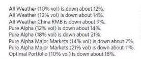 根据英国金融时报报道,近日由于疫情影响桥水基金净值跌去近20%。而在《每日观察》中,达里奥公布了桥水主要基金今年以来的净值变动情况。如下图所示,三只All Weather基金(10%波动率、12%波动率和中国基金)的净值分别下降了12%、14%、9%,两只Pure Alpha基金Pure Alpha I-12%和Pure Alpha II-18%的净值下降了14%和21%。