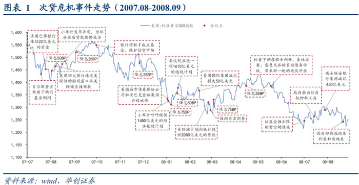 2008年金融危机前,美国已经爆发了次贷危机,始自“法巴事件”。国际金融危机起源于次贷危机,而次贷危机的“种子”是在2004年初房地产行业蓬勃发展的阶段埋下的。彼时,房地产是美国经济发展的“发动机”,伴随着货币信贷环境的不断放松,贷款产品的类型不断丰富,金融创新造就了复杂资产链条的衍生品,也使得房地产泡沫越推越高,最终迎来破灭的结局;2007年8月初,法国巴黎银行冻结资金与贝尔斯登的破产保护使得市场恐慌情绪达到高点,次贷危机全面爆发。美林证券、通用汽车等许多美国企业都遭到波及,使得美国经济承受巨大压力;随后美联储迅速采取行动,向市场注入流动性,危机一度有所好转;随后,2008年6月,标普下调摩根士利丹、美林证券、雷曼兄弟的长期债务评级,又带来新一轮的现实冲击,信贷危机重现;此时的美国信贷市场风雨飘零,政府不得不针对“抵押贷款巨头”房利美和房地美实施了一系列的救助计划,最终以收购的方式结束。