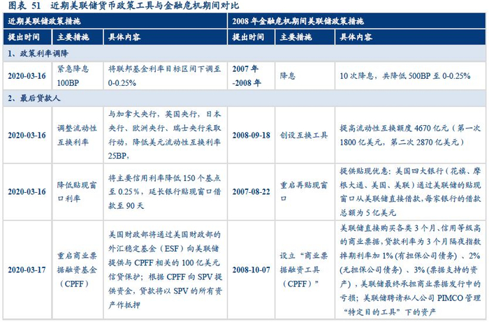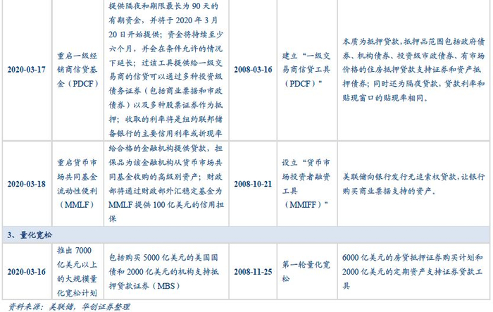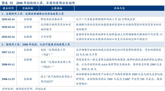 就短期而言,近期流动性危机出现后,美联储推出大量货币政策工具,而多数工具在金融危机前后已经创设。3月中旬至今,除紧急降息外,美联储先后重启贴现窗口、CPFF、PDCF、MMLF等一系列工具,但这些工具大多创设于2008年前后,主要是美联储为承担“最后贷款人”职责的创新工具,上文中已经有详尽论述;所以,美联储短期内已经动用了给一级交易商、货币基金等补充流动性的多重工具。