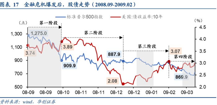 危机爆发阶段,从金融市场的“流动性危机”开始,经济衰退的趋势逐渐确认,刺激政策和市场预期相互激荡,成为大类资产运行的主导逻辑。对美股而言,雷曼兄弟宣布破产的消息给美股带来沉重的打击,流动性危机使得大量股票惨遭抛售,其中金融股所受冲击最大,银行和保险的股票当天下跌近10%。后续主导美股下行的逻辑切换为经济衰退,美股经历了从大跌到低位震荡的走势变化,这一阶段股指下跌近30%;。对于美债而言,美债经历了“震荡——走强——回调——震荡”的四个阶段,先受流动性危机影响,收益率震荡承压,后受益经济衰退的确认,2008年底美债收益率降至阶段性的历史低位2.08%;对于黄金而言,同属于避险资产的黄金则先跌后涨,在避险情绪的驱动下现货价格整体上涨30%左右;对于美元指数而言,开始收益率流动性危机下离岸美元的回流,后随着经济衰退,,市场对美元的储备货币地位失去信心,美元发生贬值。为了更方便的观察危机爆发后金融资产的走势情况,下文中我们将市场划分为四个阶段分别进行讨论: