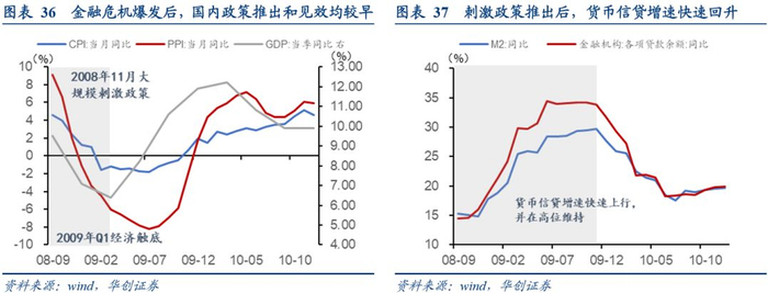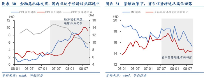 2008年,当时经济结构较为依赖外需,故国际金融危机带来的外部需求收缩对整体经济增速造成巨大冲击。前期受次贷危机的影响,2008年三季度经济增速已经下行破10%,9月金融危机爆发后,经济增速急转直下;前期带来较大通胀压力的PPI随着大宗商品的暴跌快速下行,尤其是国际油价暴跌后的拖累明显;CPI和PPI走势在2008年末和2009年初附近分别回落到负值区间,价格形势由通胀压力转为通缩压力;房地产行业投资也出现较大幅度的回落,诸多行业受到牵连,给就业带来较大压力;面对国际金融危机,国内政策反应迅速,货币政策方向逆转,最终于2008年11月提出应对金融危机的一揽子经济刺激计划,即所谓“4万亿计划”,短时间遏制了经济快速下行的方向,货币信贷增速因政策的转向也转为快速上行。