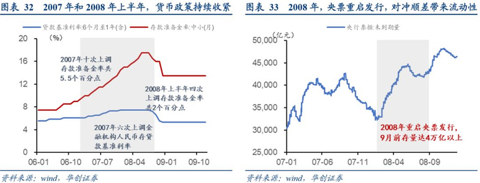 2007年货币政策逐渐由“稳健”转为“从紧”,年末的中央经济会议定调2008年政策取向是“从紧”的货币政策,抑制总需求的过度膨胀。政策明确提出“把防止经济增长由偏快转向过热、防止价格由结构性上涨演变为明显通货膨胀作为宏观调控的首要任务”;2007年央行先后十次上调存款准备金率共5.5个百分点,六次上调金融机构人民币存贷款基准利率,2008年上半年央行继续四次上调了存款准备金率共2个百分点;2008年,未抑制贸易顺差带来的流动性流入,央行重启央票的发行,2008年上半年央票未到期余额从3万多亿上升至最高约4万亿;四川汶川地震期间,货币政策的调整考虑到了自然灾害的影响,升准的过程中,灾区金融机构得以豁免,但总体未改变政策紧缩的基调;2008年年中,随着次贷危机影响的加深,货币政策进行了调整,减缓了前期紧缩力度,调减了公开市场回收力度,增加了新增信贷预期目标,但总体政策方向并未逆转。