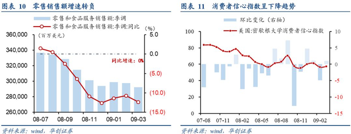 第一,金融危机使得资产大幅度缩水,负向的财富效应影响居民消费。次贷危机后,消费者信心指数一直维持低位震荡,而金融危机的爆发加剧市场对零售支出的担忧。根据美国商务部数据显示,9月零售销售额同比增速由正转负,同比下降2.5%,而后进一步下降至-12.57%。