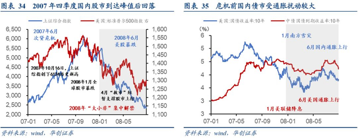 对债市而言,2007年6月收益率随经济增速调整至相对高位后,基本处于高位震荡状态,美债收益率在次贷危机后已经开始趋势性下行;2008年1月附近,美联储降息后美债收益率快速下行,国内债市受外盘影响,叠加南方出现冰雪灾害影响经济增长,收益率也明显下行;2008年6月附近,国内和美国债市均受到本国通胀上行的预期扰动,通胀共振的来源是国际大宗商品,6月布油触及了140以上的历史性高位。