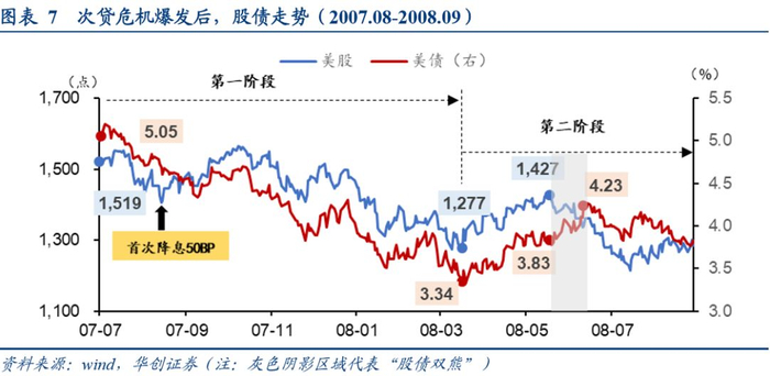 1、第一阶段(2007.08-2008.03):次贷危机下股市转熊,债市、黄金表现强劲