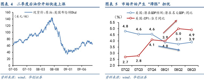 金融危机爆发后,通胀担忧快速回落。2008年9月初,油价出现急剧下跌,缓解了市场对通胀的担忧;但油价的下行反映出全球经济增长疲软的现状,美国经济衰退的预期强烈。而金融危机也在以下几个方面引发了经济衰退: