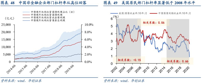 与2008年相比,当前国内金融市场开放程度显著增大,也使得海外流动性危机下国内债券市场承受抛压。2008年股市和债市在金融危机高峰阶段也受到显著冲击,但总体与海外市场的相关性较低,资产价格表现主要跟随国内政策调整而变化;随着金融市场开放的推进,外资在国内债市的持仓占比逐步抬升,至2020年2月份境外机构持仓国债在国债总托管量中的占比达到9%;故在流动性危机之下,海外套利资金境外融资渠道难以为继,抛售人民币债券资产回补头寸,使得短期人民币债券承受抛压;但由于总体占比较小,且流动性危机度过后,人民币资产的吸引力仍在,故大概率不会对国内债券是市场形成系统性压力,而是叠加国内收益率快速下行后的调整压力,扰动债市。