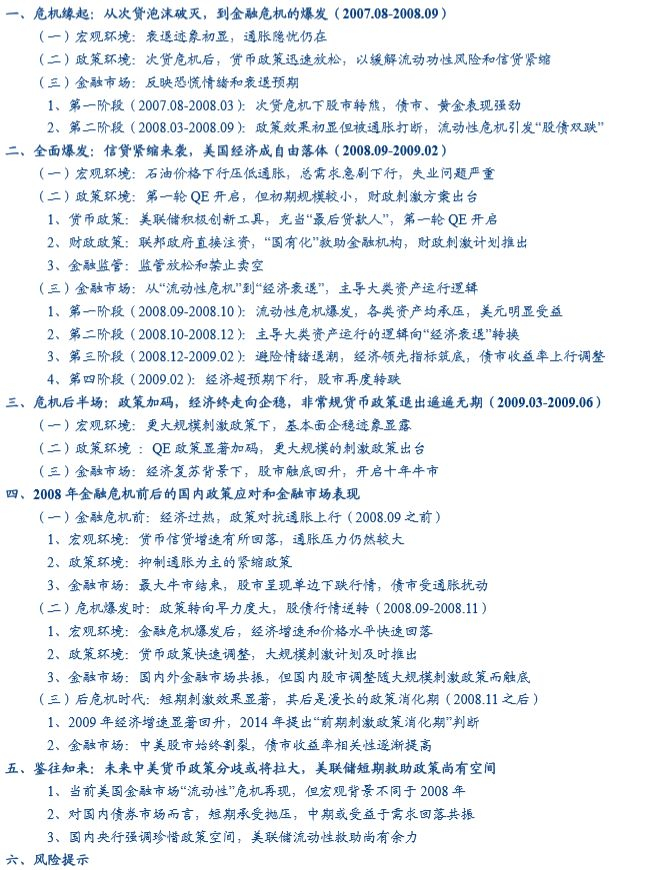 上文细致梳理了金融危机爆发前后的美国宏观经济环境和政策,及金融市场运行。从次贷危机的发生到国际金融危机的爆发,再到强刺激政策出台后增长边际的企稳,上文将金融危机划分成三个阶段;对比国内,三个阶段对应的时间点上,2008年9月危机爆发前,国内宏观背景主要在于抑制经济过热和通胀上行;危机爆发后国内在2008年11月份推出四万亿计划,早于美国推出扩容版QE的2009年3月;后续经济企稳迹象主要在2009年一季度,也早于美国宽松政策见效的2009年二季度。